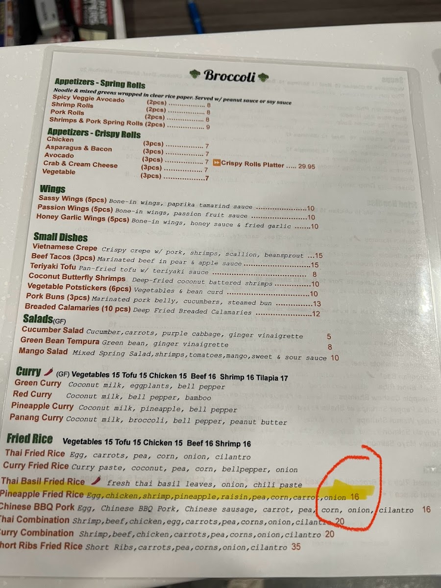 Fresh Thai basil, onion, chicken, beef, shrimps